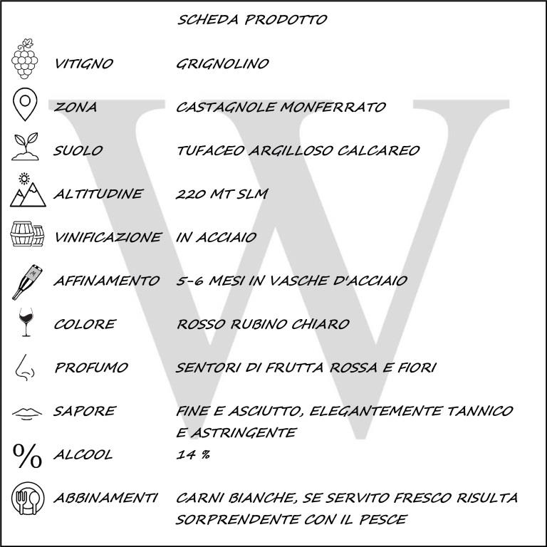 Coltivato su un terreno rosso leggermente sabbioso, caratteristica molto importante per ottenere un prodotto di alta qualità. Vino di media struttura, si presenta di un colore rosso rubino tenue con sfumature tendenti all’aranciato. I suoi profumi ricordano la rosa e il pepe, al gusto è asciutto, leggermente amaro ed elegantemente tannico. Perfetto con la tipica “bagna cauda” piemontese, sorprendente servito leggermente freddo con piatti a base di pesce.