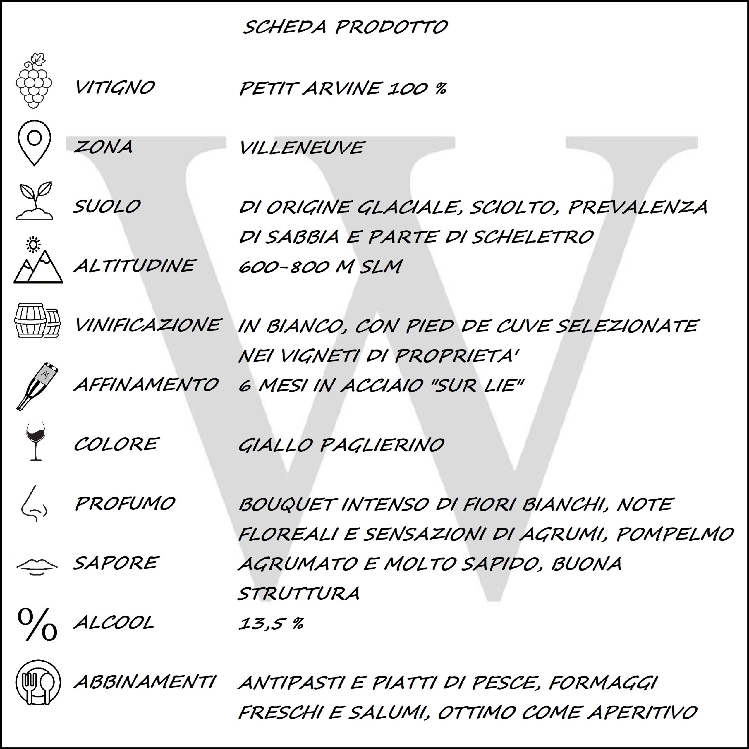 Nella selezione di Petite Arvine della linea classica si vuole esprimere tutta la freschezza e gli incantevoli profumi tipici di questa varietà valdostana. Di pronta beva, il vino che ne scaturisce ha colore paglierino brillante, con profumi intensi, note floreali e sensazioni di agrumi, in particolare pompelmo rosa; freschezza e autenticità la fanno da padrone in questa etichetta 100% Petite Arvine della Valle d’Aosta.